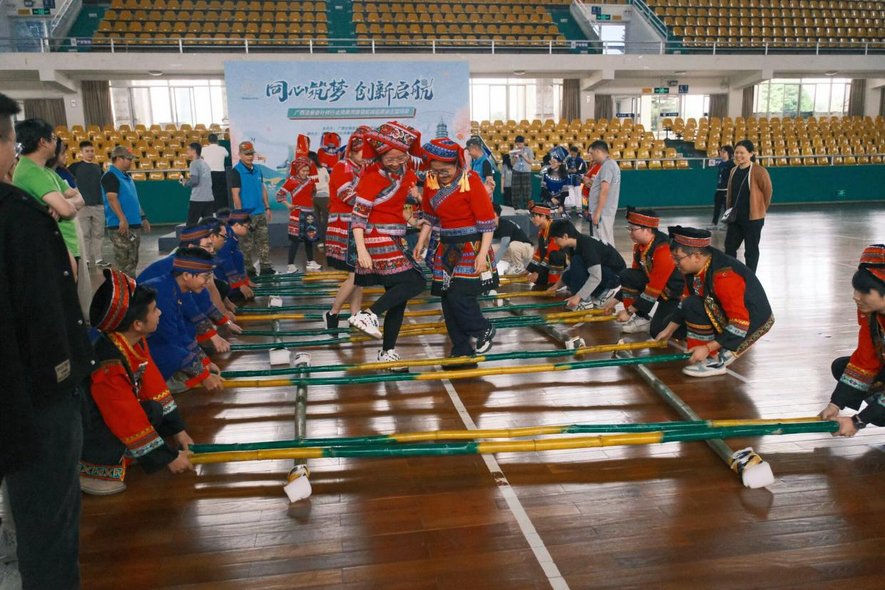 活動(dòng)中,我們共同體驗(yàn)了壯族歌舞的魅力,并且換上了民族服飾體驗(yàn)了廣西民族特色—竹竿舞,感受到了“廣西三月三”特殊濃厚的民族文化氛圍魅力。此外,大家以飽滿的熱情和高漲的積極性參與了挑扁擔(dān)、拋繡球、鐵環(huán)接力等富有民族特色的競(jìng)技項(xiàng)目,在比賽中揮灑著汗水為集體榮譽(yù)拼搏著,展現(xiàn)出了團(tuán)結(jié)協(xié)作、挑戰(zhàn)自我、互相鼓勵(lì)的精神風(fēng)貌。